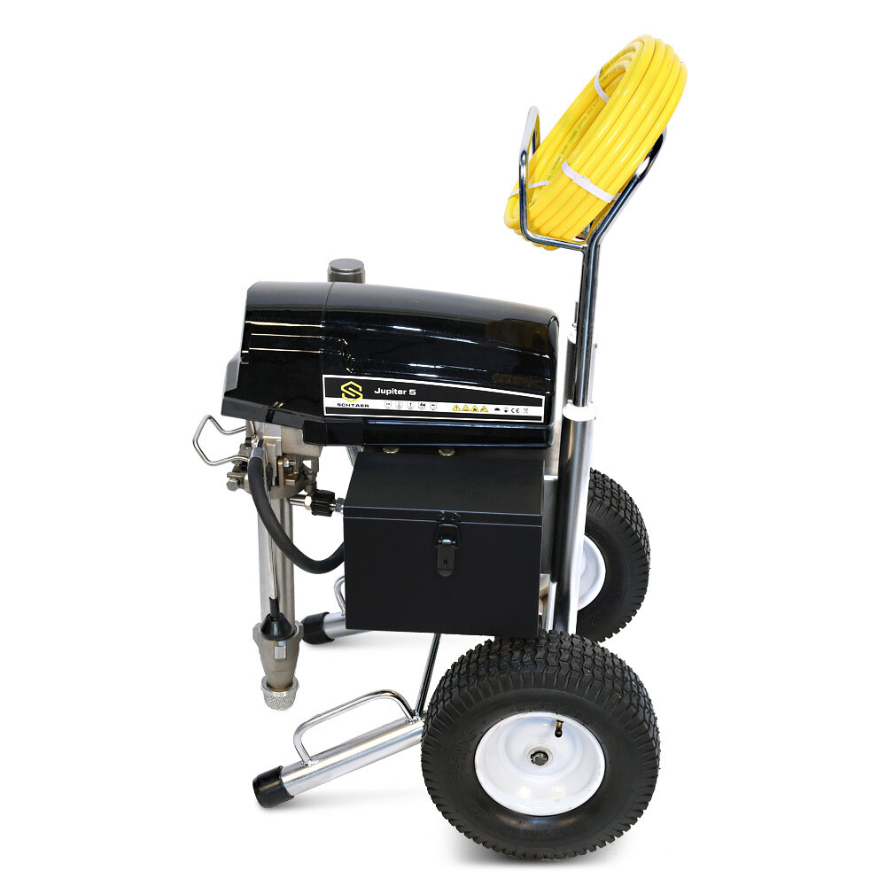 Schtaer Jupiter 5 – представляет собой универсальную окрасочную машину для распыления вязких лакокрасочных материалов безвоздушным методом. Обладает высокой производительностью, распыляет краску со скоростью 5,1 л/мин, способна работать на значительном удалении от установки (при подключении шланга максимальной длины). Аппарат обладает мощностью 2,6 кВт, работающий под давлением 227 Бар обеспечивает равномерное распределение лакокрасочных материалов разной степени вязкости по окрашиваемой поверхности. Модель считается универсальной так как работает с различными лакокрасочными материалами. Его можно использовать для нанесения теплоизоляции, распыляемой однокомпонентной гидроизоляции, с красками по металлу, грунту, а также с эпоксидными материалами. Для работы прибора требуется розетка с напряжением в 220 В. Совместим с наконечниками разного диаметра (максимальный размер 631).